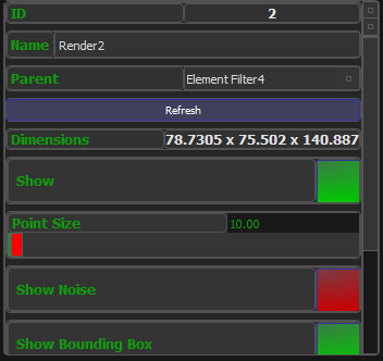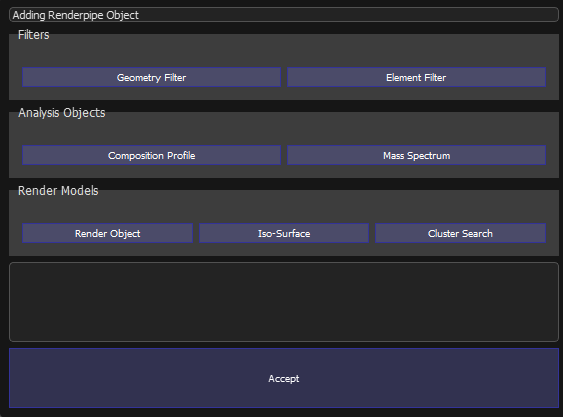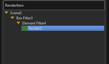Below the Button there is the Render Tree. It contains a hierarchical structure of all the currently added objects. Data passes from the top level to all its children and from every child to its own children. In this picture the Scene passes the data to the box filter. The box filter out all elements and molecules that are on its outside and then passes the data to the element filter. The element filter removes all elements and molecules of certain types (user decides) and then passes the data to the Render Object which displays every element and molecule in 3D